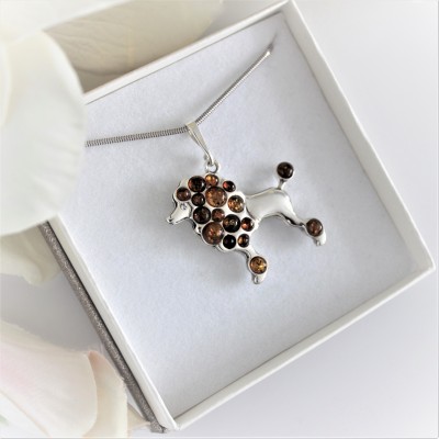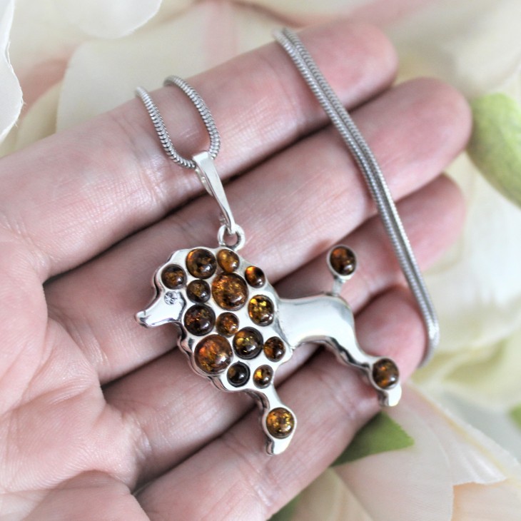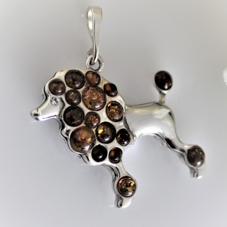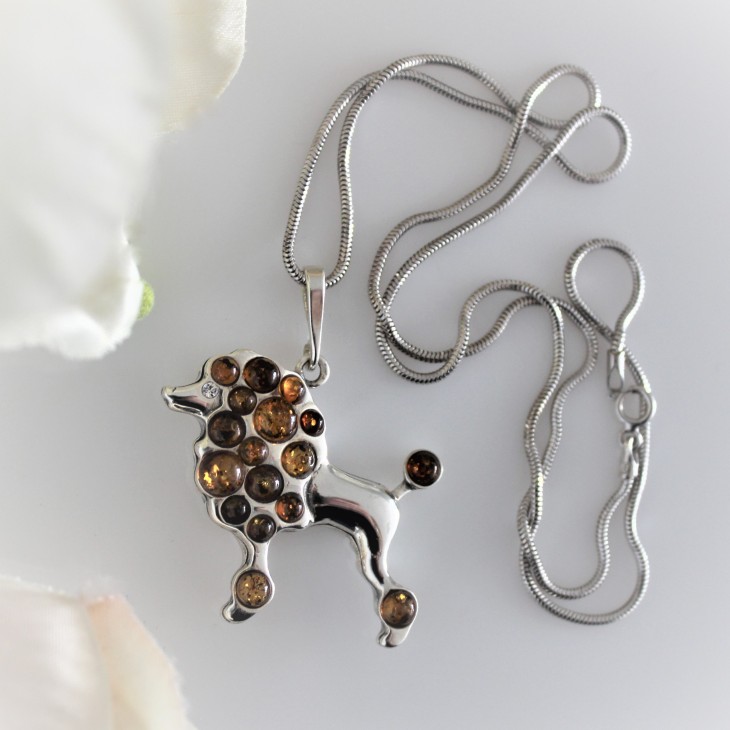 Ekskluzywna zawieszka w kształcie Pudla z koniakowymi bursztynami.