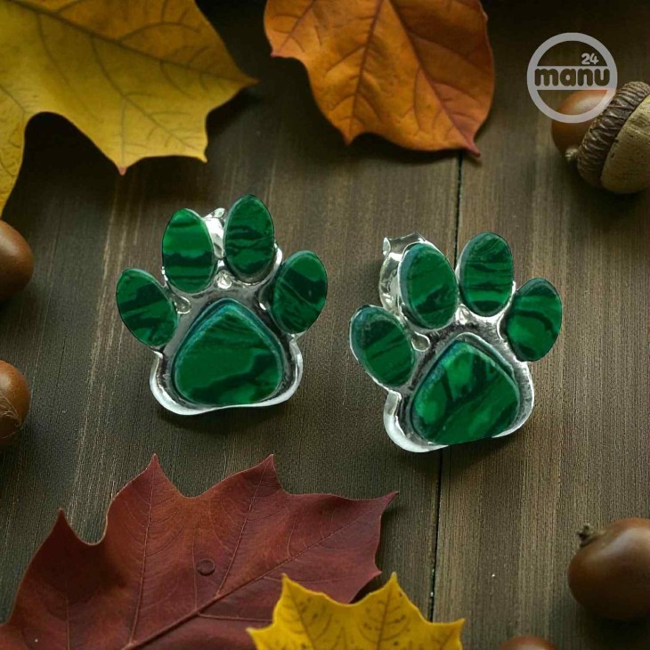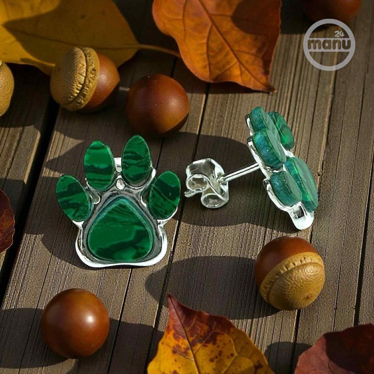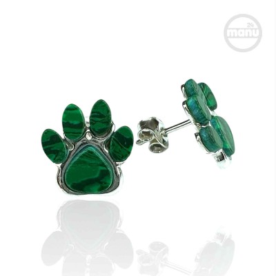 Kolczyki srebrne 925 w kształcie psiej lub kociej łapy z naturalnym malachitem.
