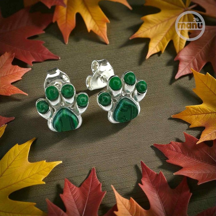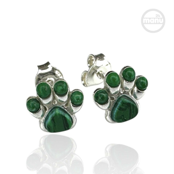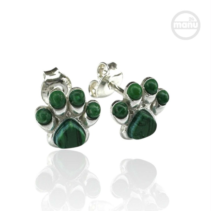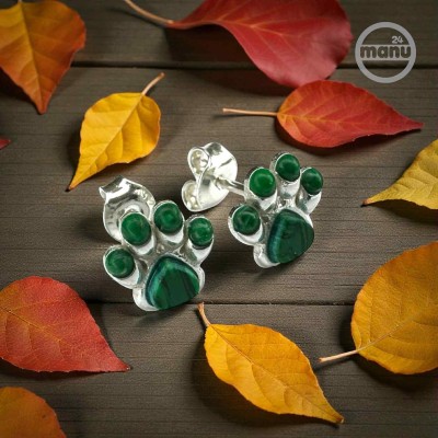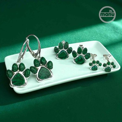 Srebrne kolczyki 925 z naturalnym malachitem w kształcie psiej lub kociej łapy.