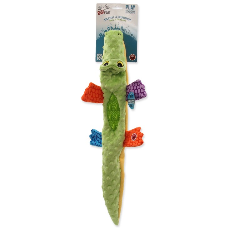 Przyjemna w dotyku, mięciutka zabawka dla psów. Kolorowy krokodyl, wykonany z przyjemnego w dotyku materiału, posiadający na grzbiecie plastikowe wypustki, masujące dziąsła psa w trakcie zabawy. Długość zabawki: 60cm